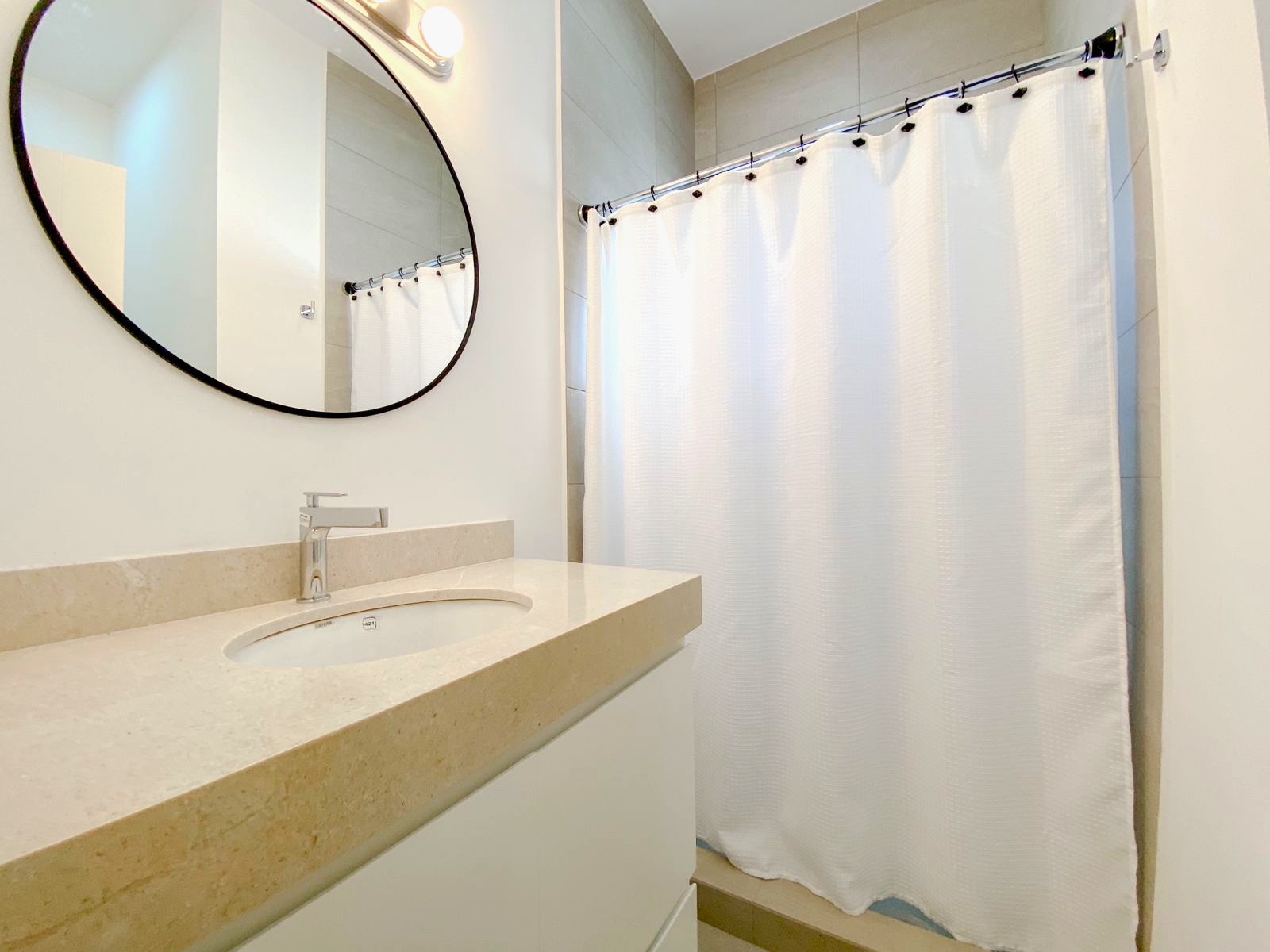 Recibidor, sala, comedor, cocina integral equipada y con isla, medio baño, lavandería, 1 Recámara con Walk-in Clóset y baño completo.