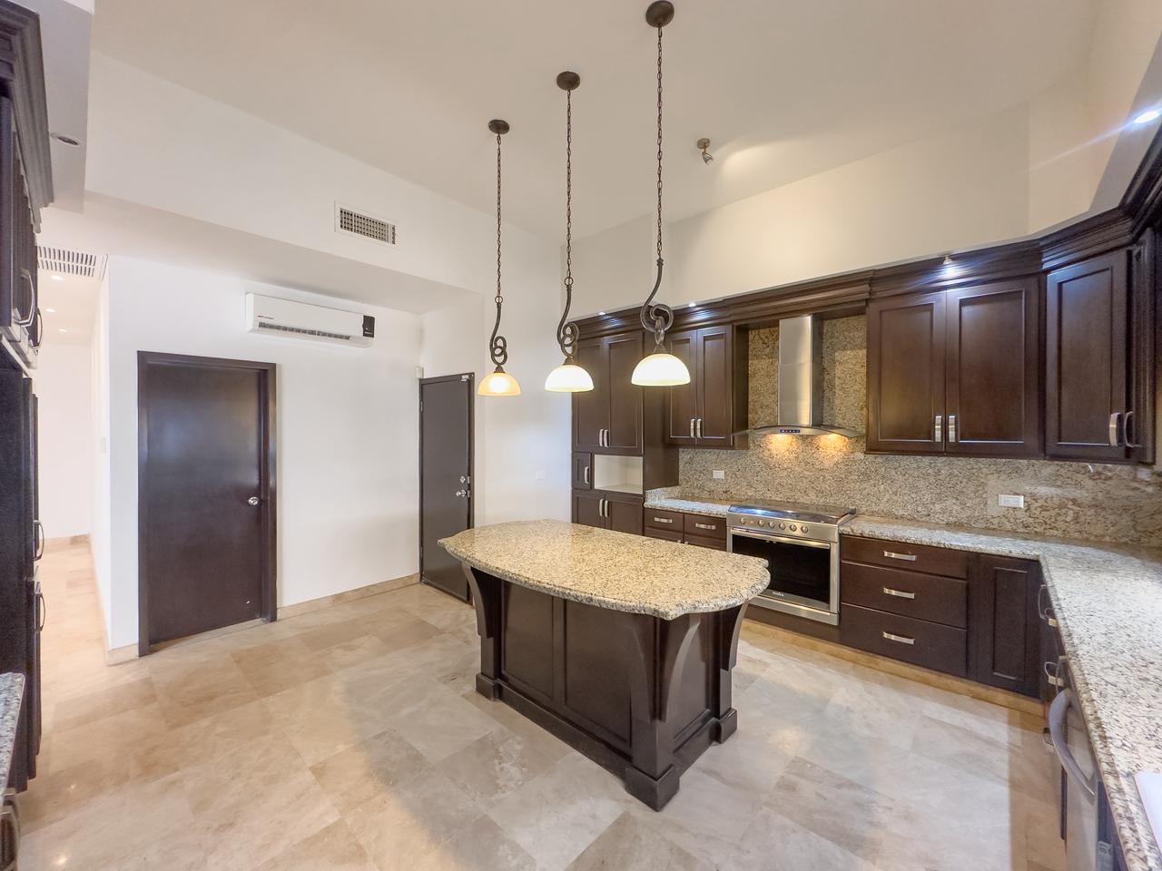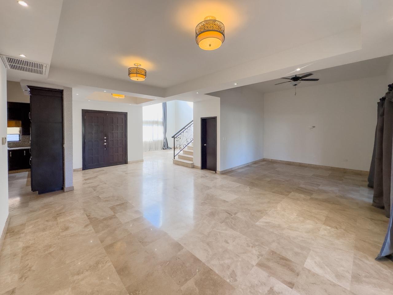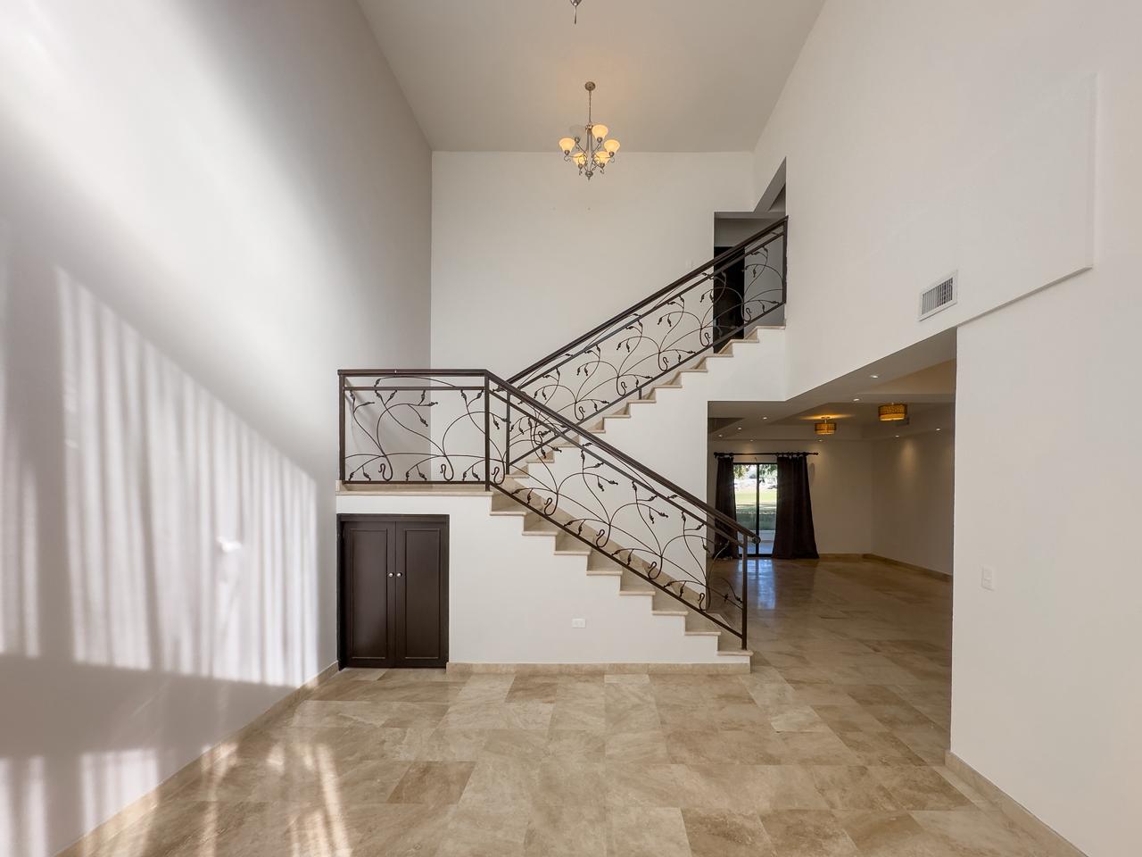 Sala doble altura, comedor y estancia con vista al campo de golf, cocina integral con cubierta de granito y con isla, cuarto de lavado y cuarto de servicio con baño completo con salida al patio.