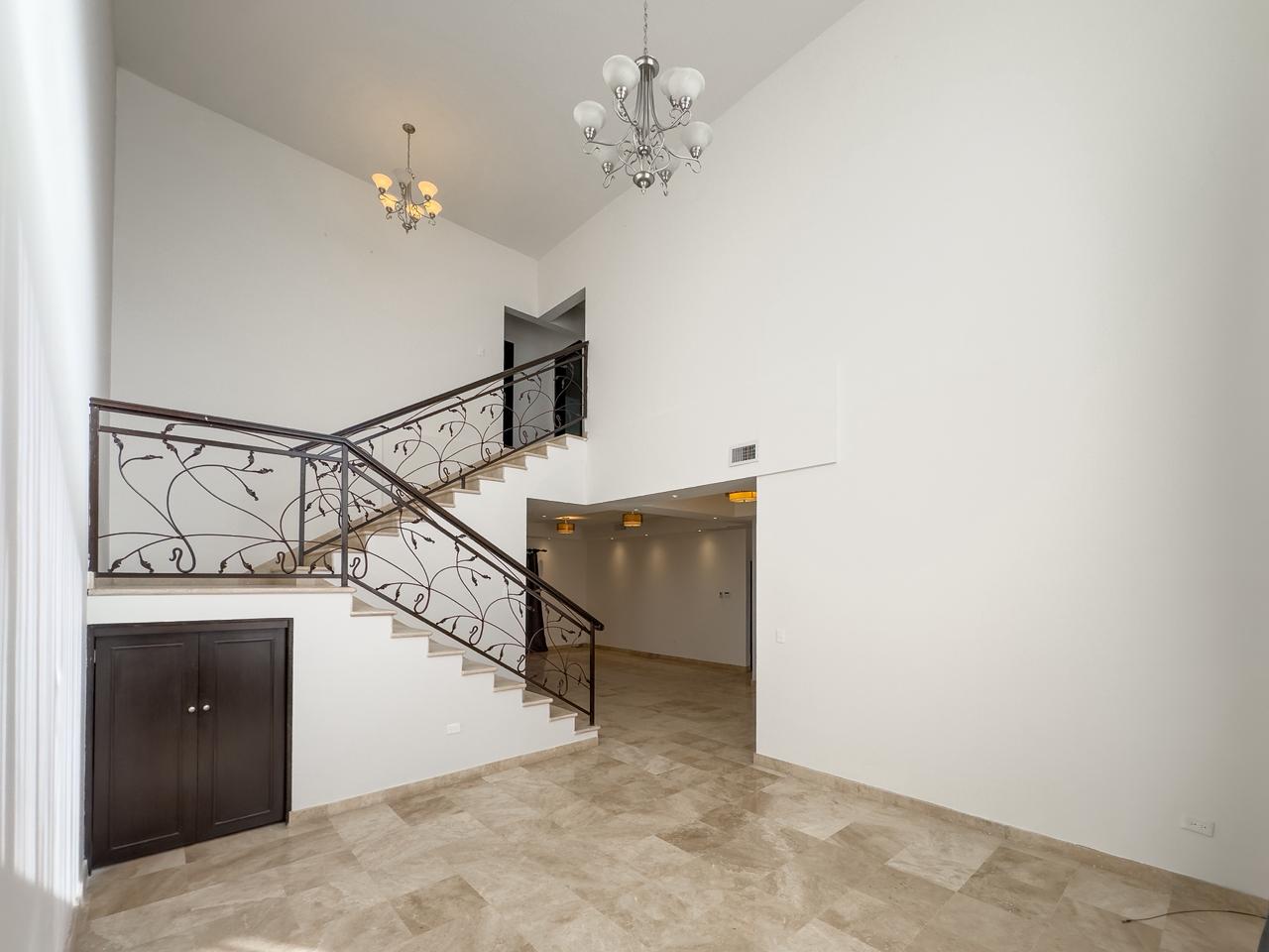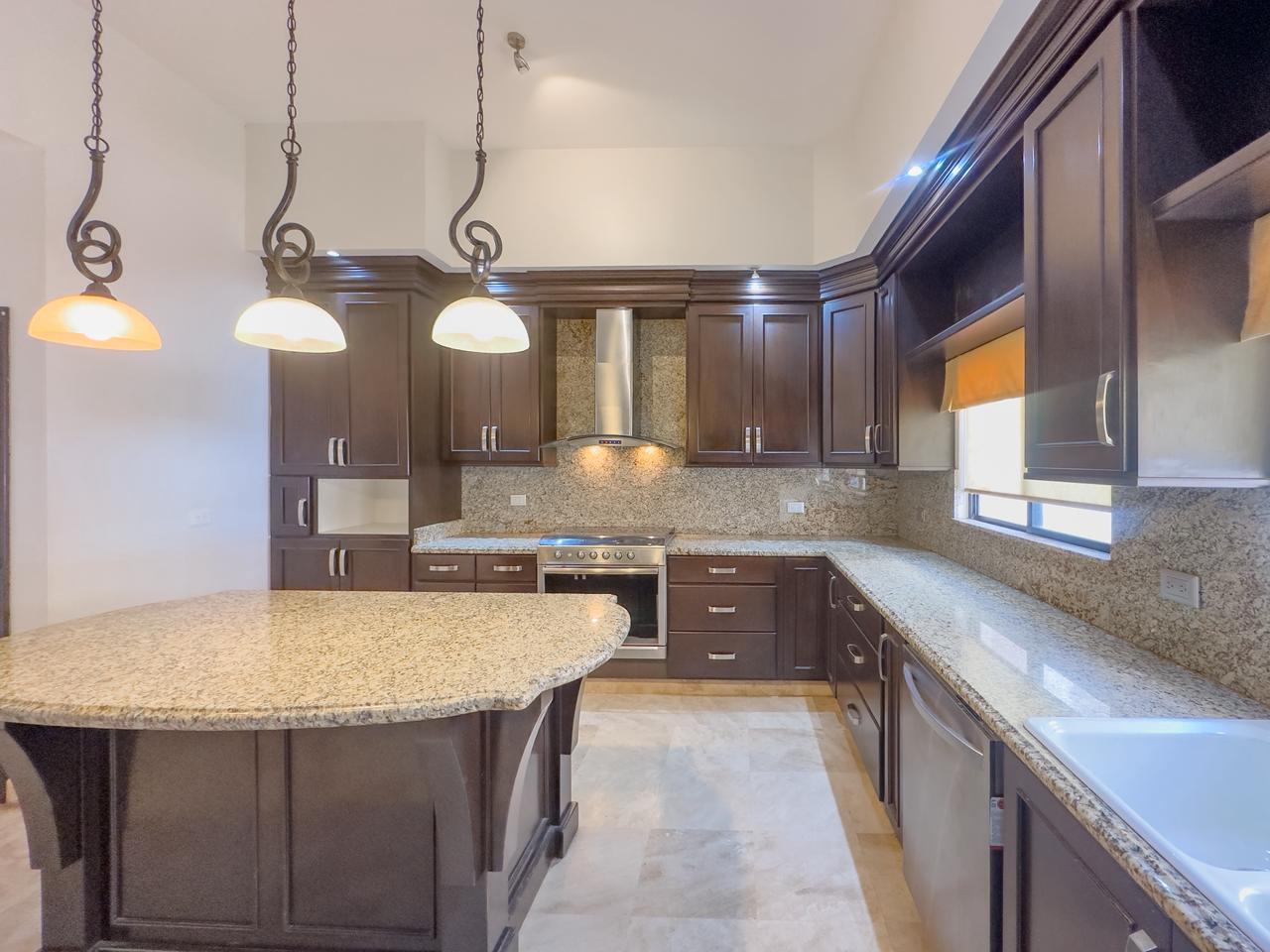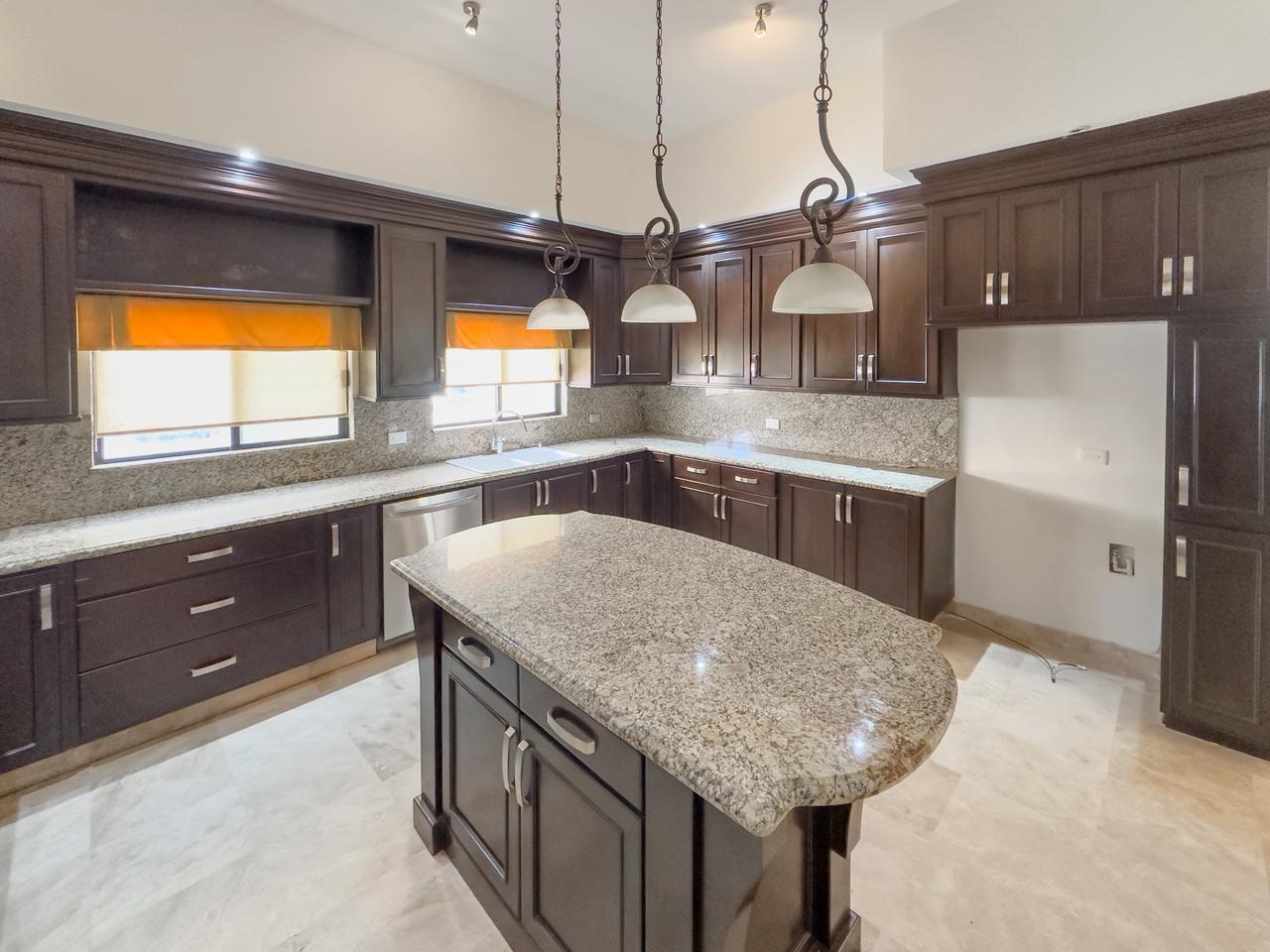 Sala doble altura, comedor y estancia con vista al campo de golf, cocina integral con cubierta de granito y con isla, cuarto de lavado y cuarto de servicio con baño completo con salida al patio.